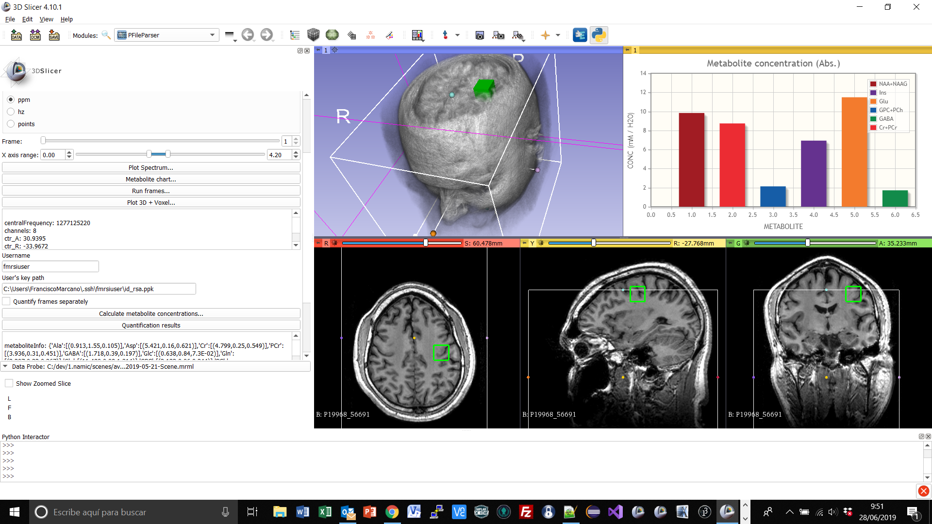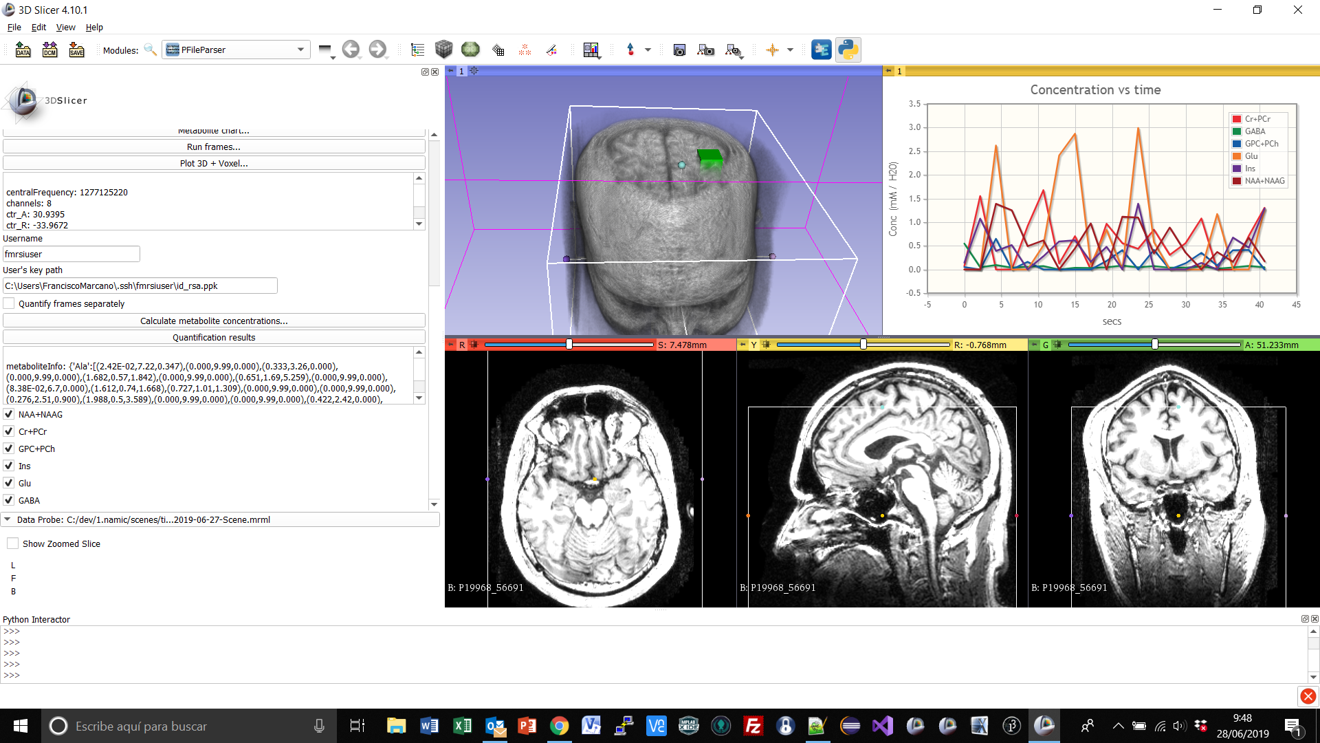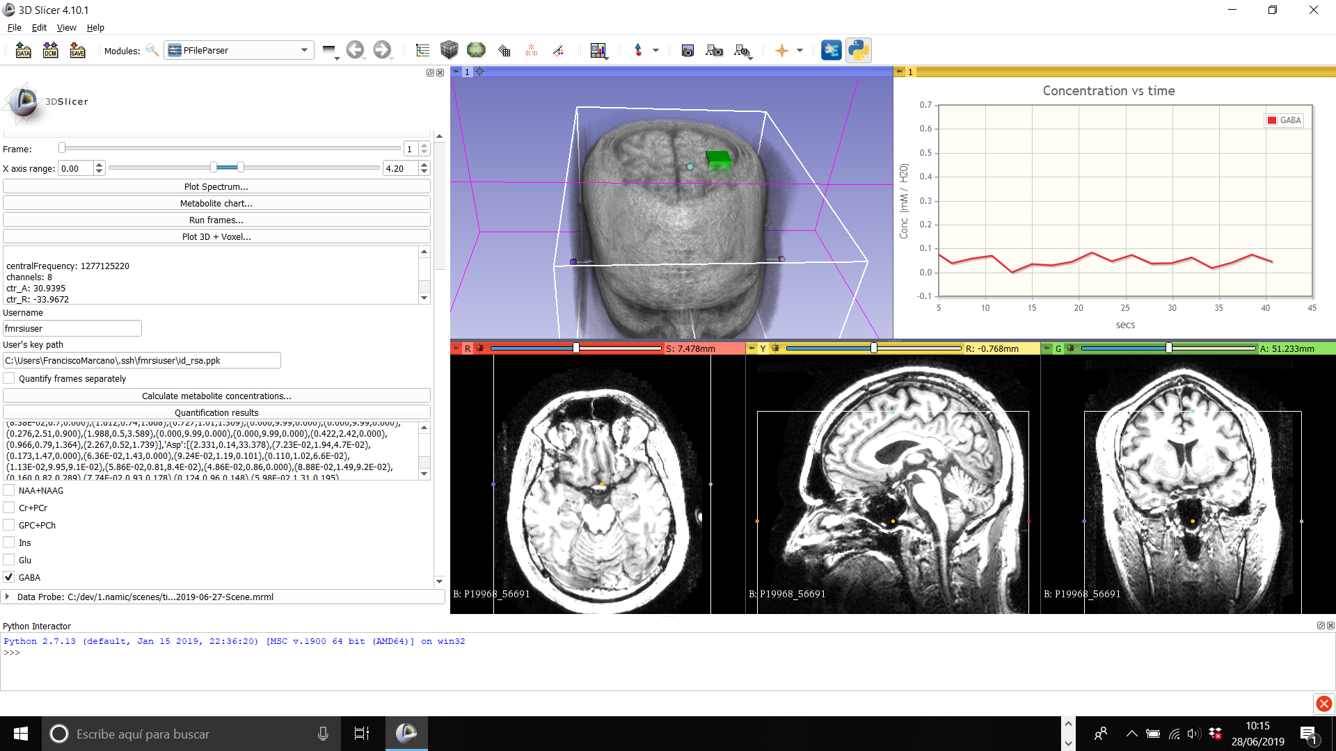 The aim of this project is to implement algorithms to process single voxel or chemical shift imaging time sequences in Slicer. A sequence is compose of frames with a period of NEX*TR sec each. The output of the processing is an estimated sequence of spectra with increased signal-to-noise ratio (SNR). SNR-improved sequence could be used to extract the chemical kinetic information of metabolites might be found in the original sequence in ideal absence of noise, and improve quantification of low-concentration metabolites in each frame. Processed sequences are quantified by third-party software. Algorithms have previous been coded in Matlab, and it is proposed their translation to 3D Slicer numeric and scientific library framework. It is also encouraged to implement secure communication routines to interact with quantification software from 3D Slicer application.